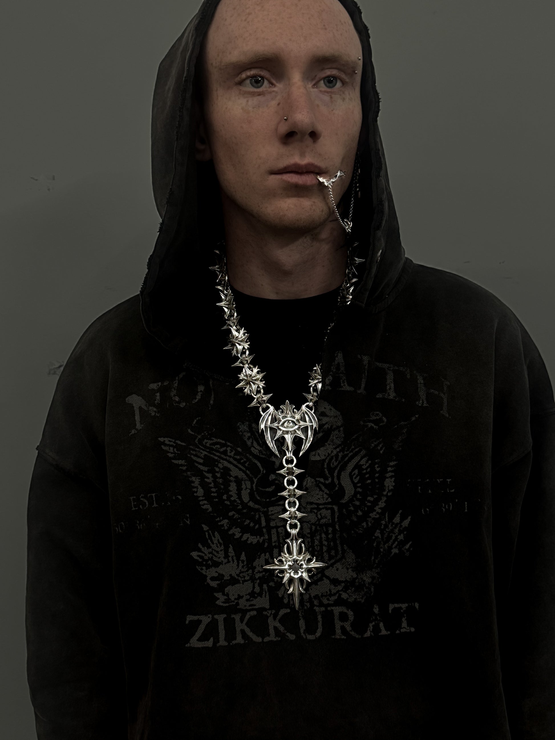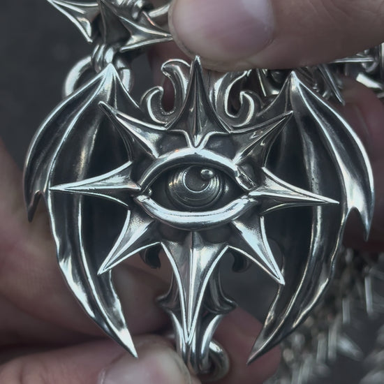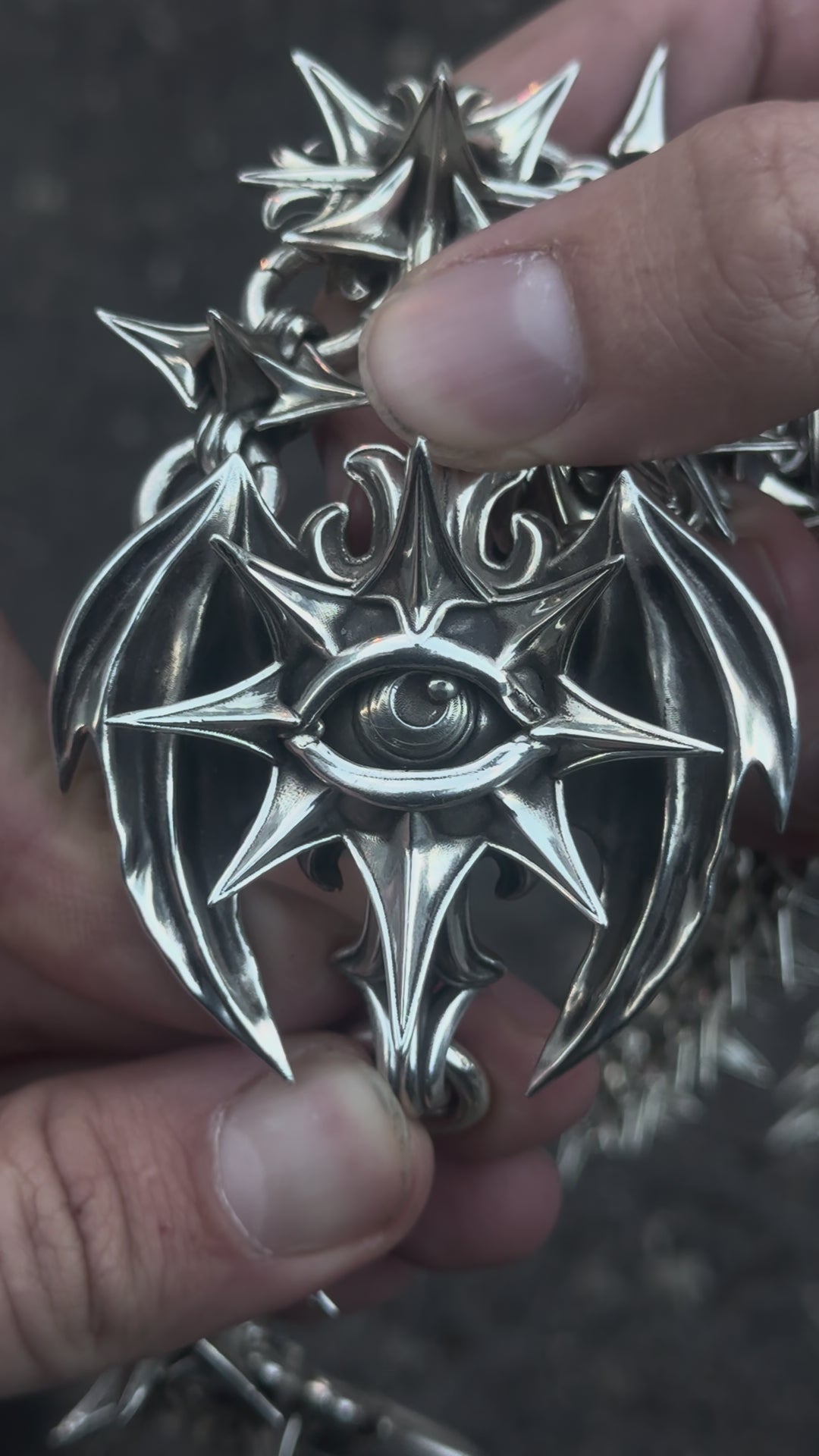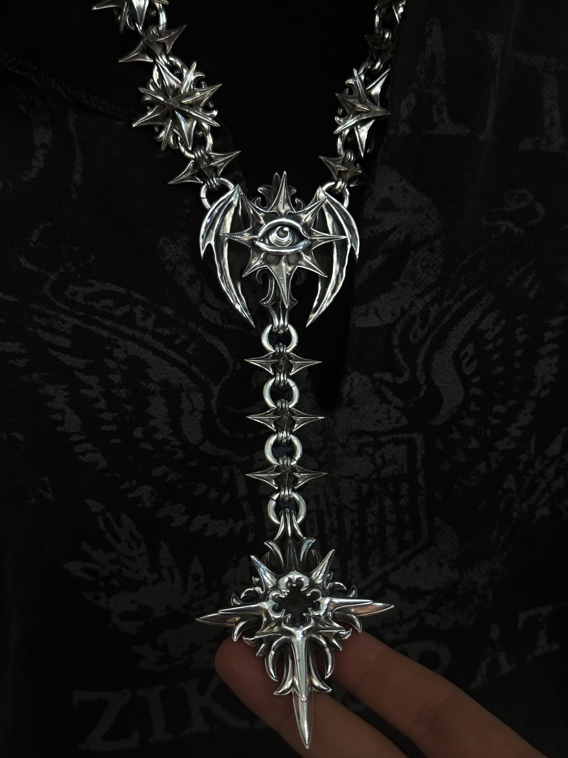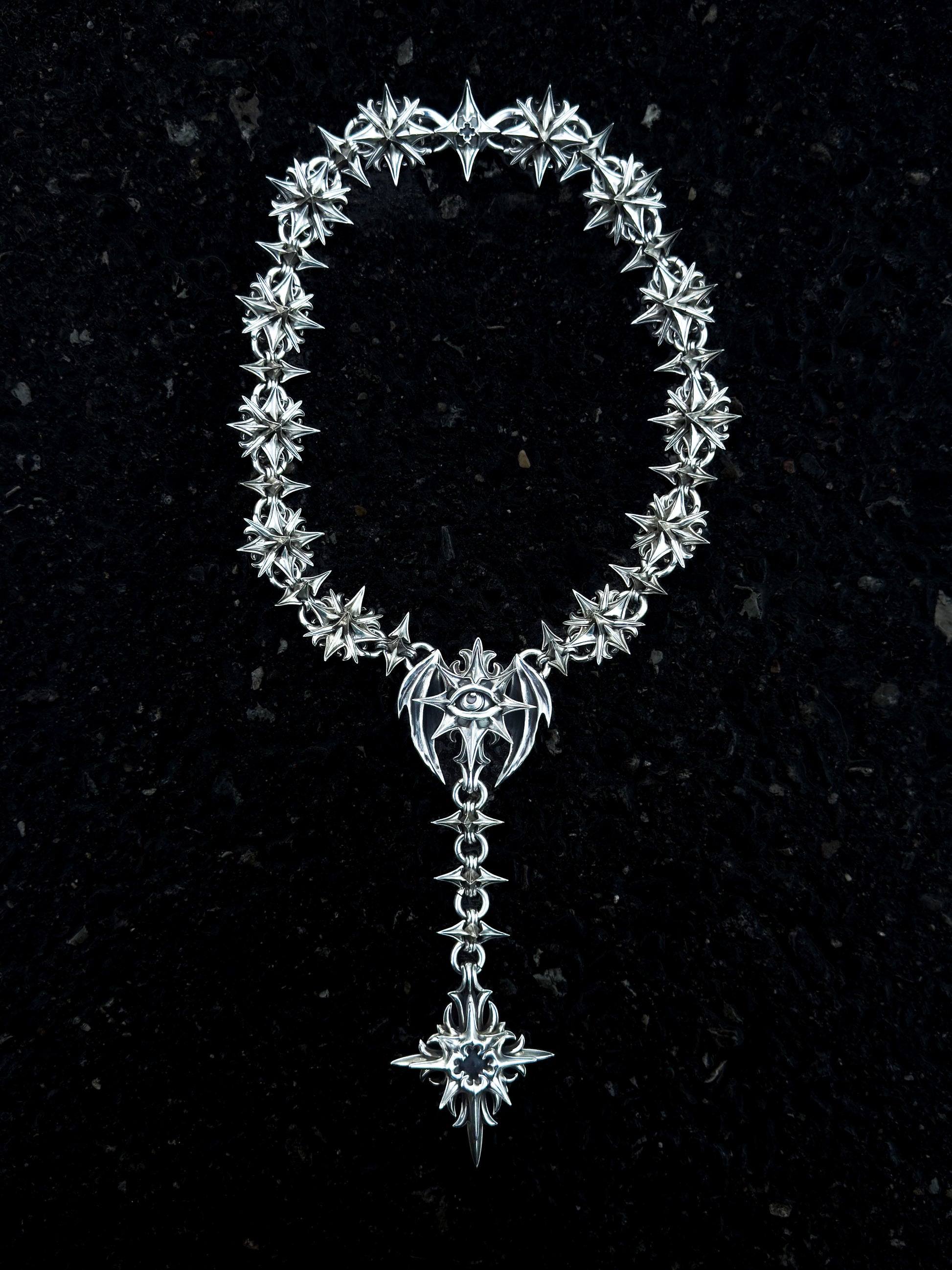 Who wants subtle? This detail filled chain has custom elements from top to bottom. With a new clasp mechanism super simple to use all the way down to the moving eye pendant sitting in the middle, holding onto the rosary styled pendant on the bottom. Only for ones looking to make a statement. Comes in stainless steel.